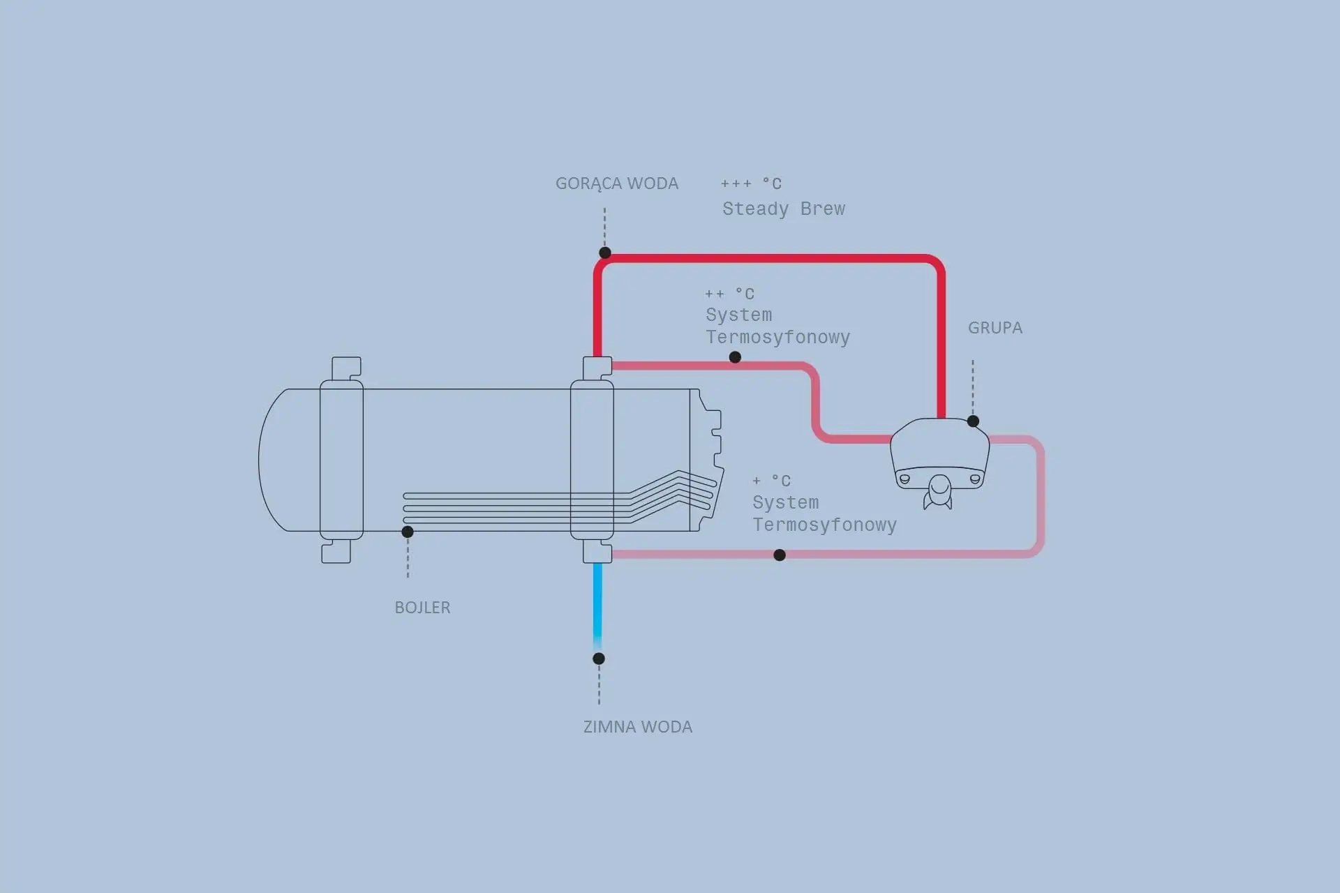 Technologia Rancilio Steady Brew (SB) jest wynikiem ewolucji tradycyjnego systemu termosyfonowego, która wprowadza zestaw innowacyjnych funkcji zaprojektowanych w celu poprawy wydajności wszystkich jedno-kotłowych ekspresów do kawy. Utrzymując stałą temperaturę wody podczas ekstrakcji, Steady Brew gwarantuje doskonałą stabilność termiczną, niezawodność i maksymalną powtarzalność, zarówno w okresach intensywnej pracy, jak i w warunkach niskiego zużycia.